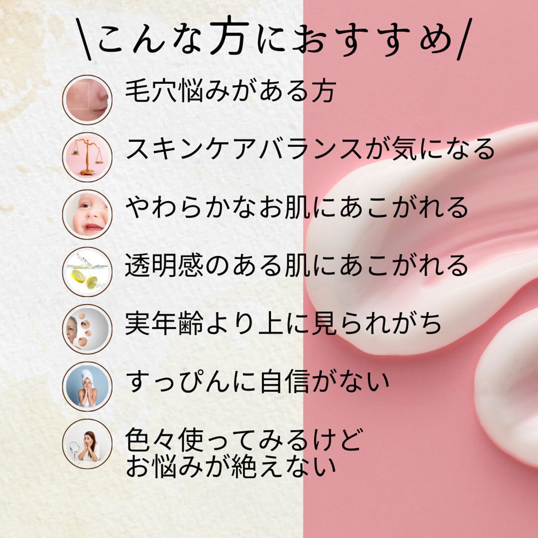 スキンケアバランスが気になる、色々使ってみるけどお悩みが絶えない、すっぴんに自信がない、実年齢より上に見られがち