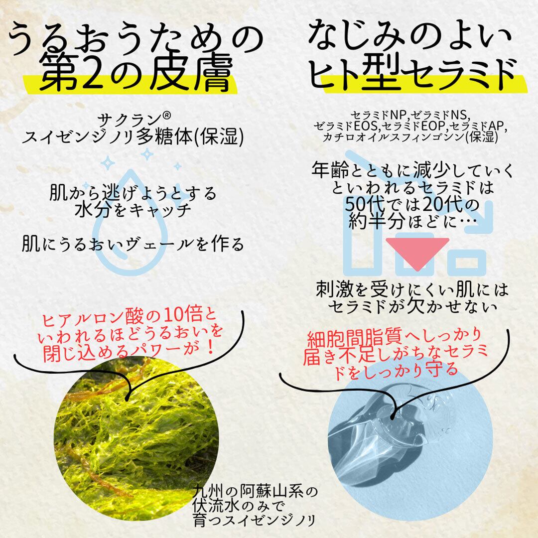 水・BG・テトラヘキシルデカン酸アスコルビル(※)・グリセリン・スクワラン・シクロペンタシロキサン・ペンチレングリコール・ジメチコン・水添ナタネ油アルコール・パンテノール(※)・ビスグリセリルアスコルビン酸(※)・ナイアシンアミド(※)・ビオチン(※)・リボフラビン(※)・葉酸(※)・パルミチン酸アスコルビル(※)・アスペルギルス/加水分解コラーゲン発酵液・シロバナルーピン種子エキス・チオクト酸・水添レチノール(※)・グルコシルヘスペリジン(※)・リノール酸レチノール(※)・カラスムギ穀粒エキス・クラドシホンノバエカレドニアエ多糖体・スイゼンジノリ多糖体・ダイズ芽エキス・ソメイヨシノ葉エキス・センチフォリアバラ花エキス・プエラリアミリフィカ根エキス・セラミドNP・セラミドNS・セラミドEOS・セラミドEOP・セラミドAP・カプロオイルフィトスフィンゴシン・カプロオイルスフィンゴシン・ヒトオリゴペプチド-1・ヒトオリゴペプチド-13・アーチチョーク葉エキス・コレステロール・ベヘン酸・サンザシエキス・ナツメ果実エキス・クエン酸・オレンジ果汁・ライム果汁・レモン果汁・グレープフルーツ果実エキス・リンゴ果実エキス・フィトステロールズ・トコフェロール(※)・ヒマワリ種子油・(アクリル酸ヒドロキシエチル/アクリロイルジメチルタウリンNa)コポリマー・ポリソルベート60・トリ(カプリル酸/カプリン酸)グリセリル・水添レシチン・シアノコバラミン・セテアレス-25・セタノール・イソステアリン酸ソルビタン・エチルヘキシルグリセリン・キサンタンガム・フェノキシエタノール・香料