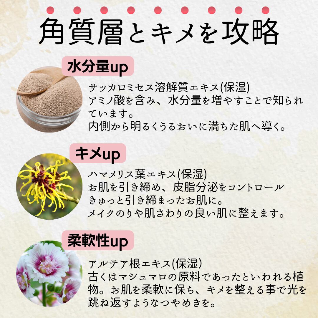 〇チトカタライザー・・・パン酵母由来で、明るくツヤのあるイキイキした肌にみちびきます。サッカロミセス溶解質エキス(保湿)