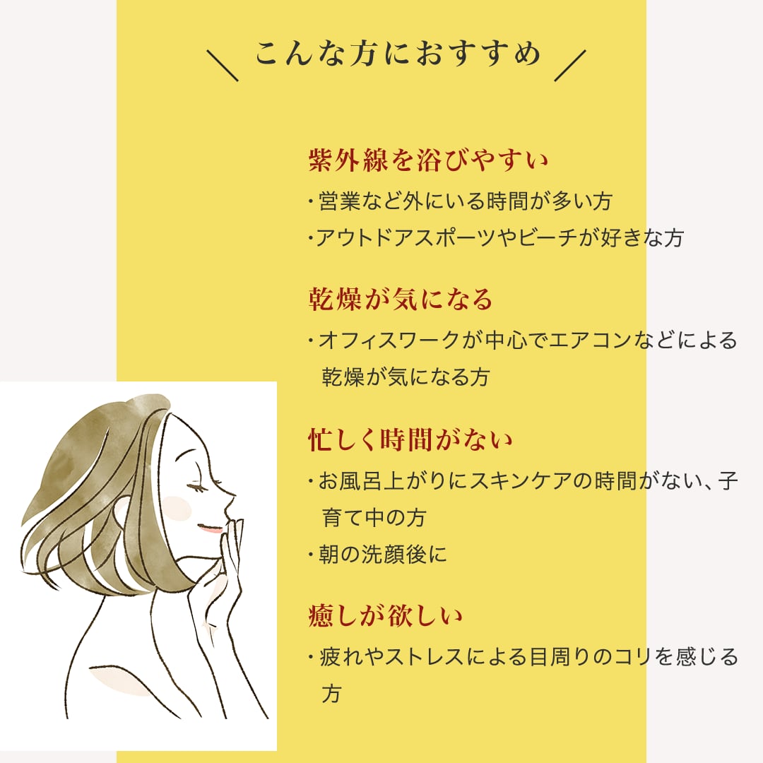 エアコンや紫外線など、過酷な環境にさらされるお肌をやさしくいたわります。