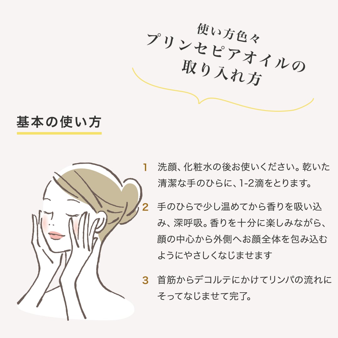 洗顔、化粧水の後お使いください。乾いた清潔な手のひらに、1-2滴をとります。